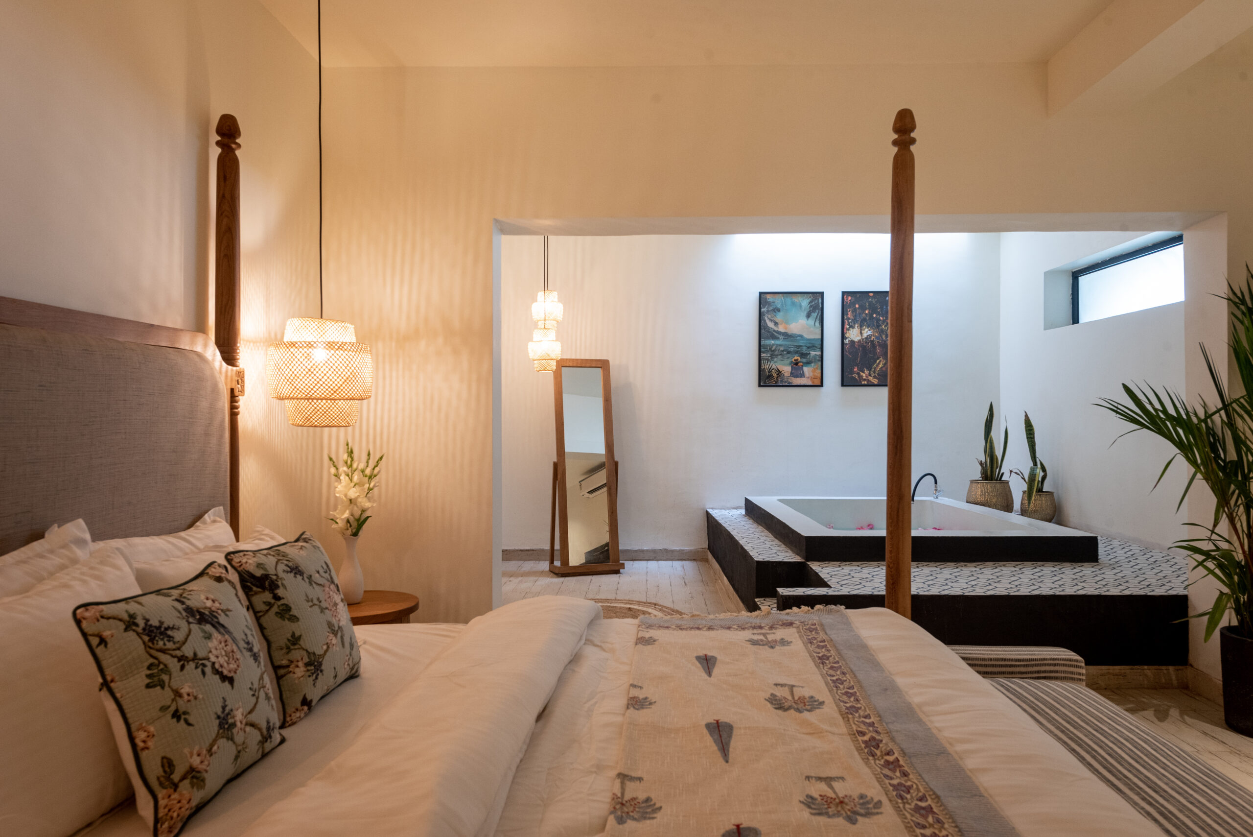 Inspired by the philosophy of susegad, the design embraces a slow, nature-oriented lifestyle, blurring indoor and outdoor boundaries. A 16-foot glass façade anchors the living space, while a palette of stone, wood, and soft neutrals enhances the surrounding landscape with warmth and restraint.