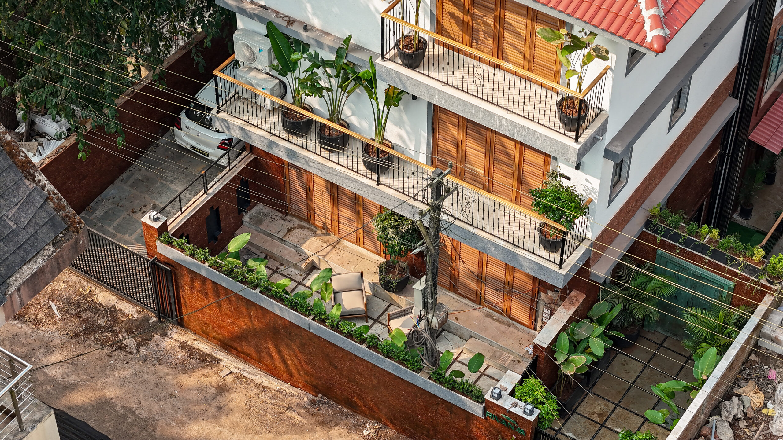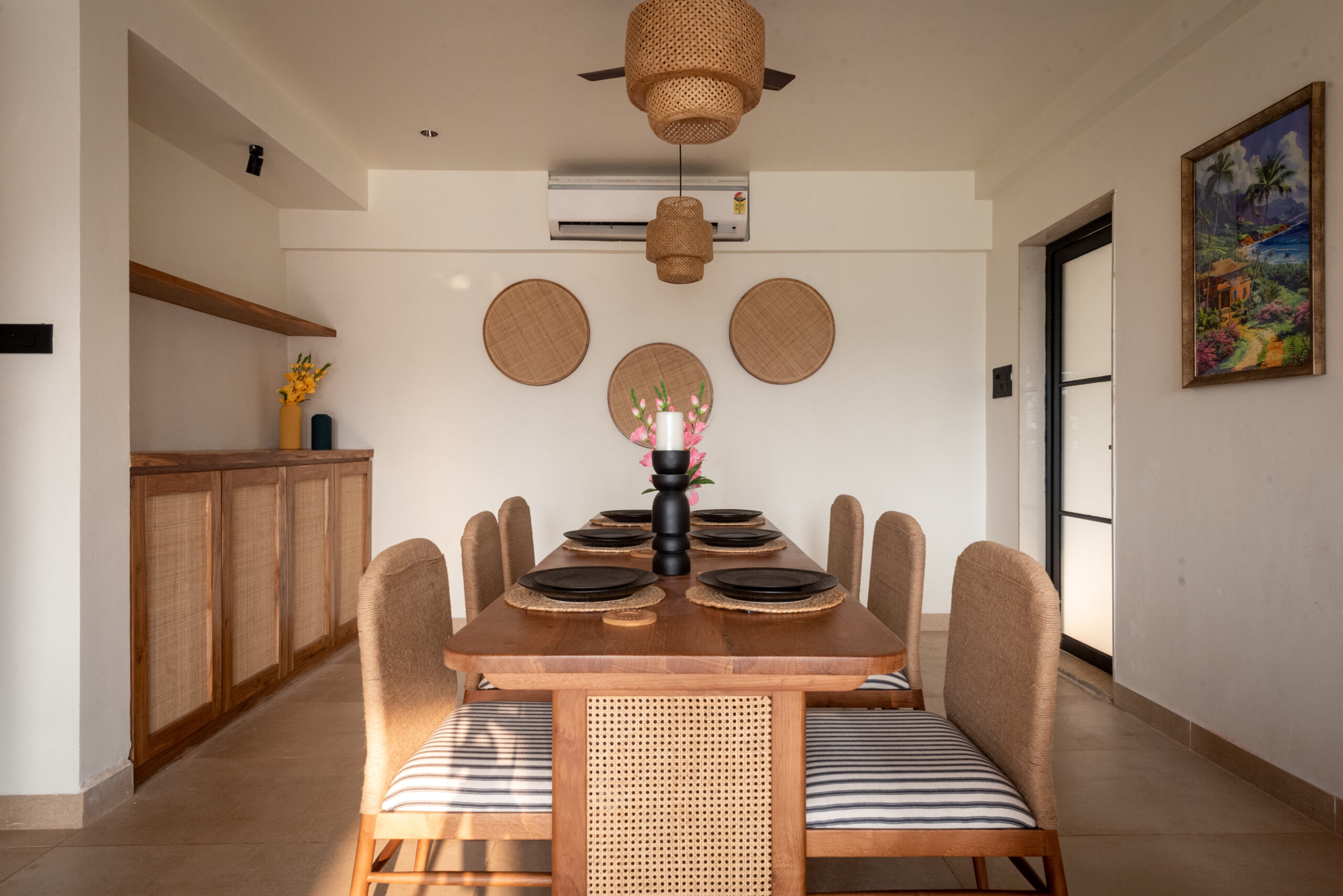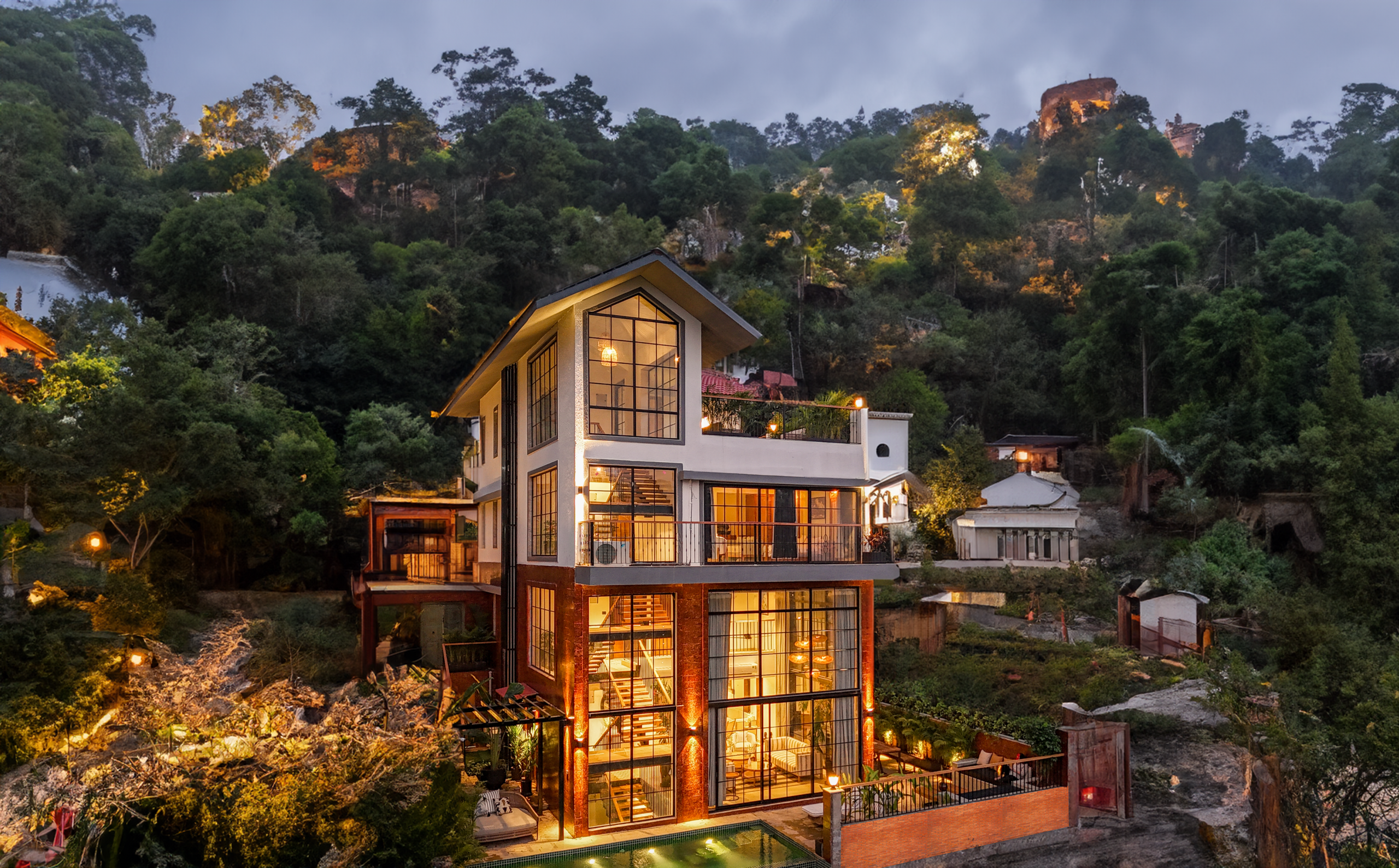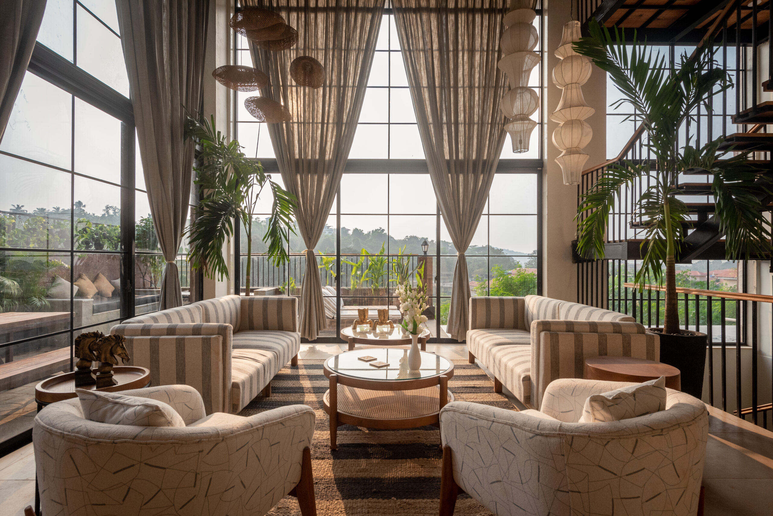 Inspired by the philosophy of susegad, the design embraces a slow, nature-oriented lifestyle, blurring indoor and outdoor boundaries. A 16-foot glass façade anchors the living space, while a palette of stone, wood, and soft neutrals enhances the surrounding landscape with warmth and restraint.