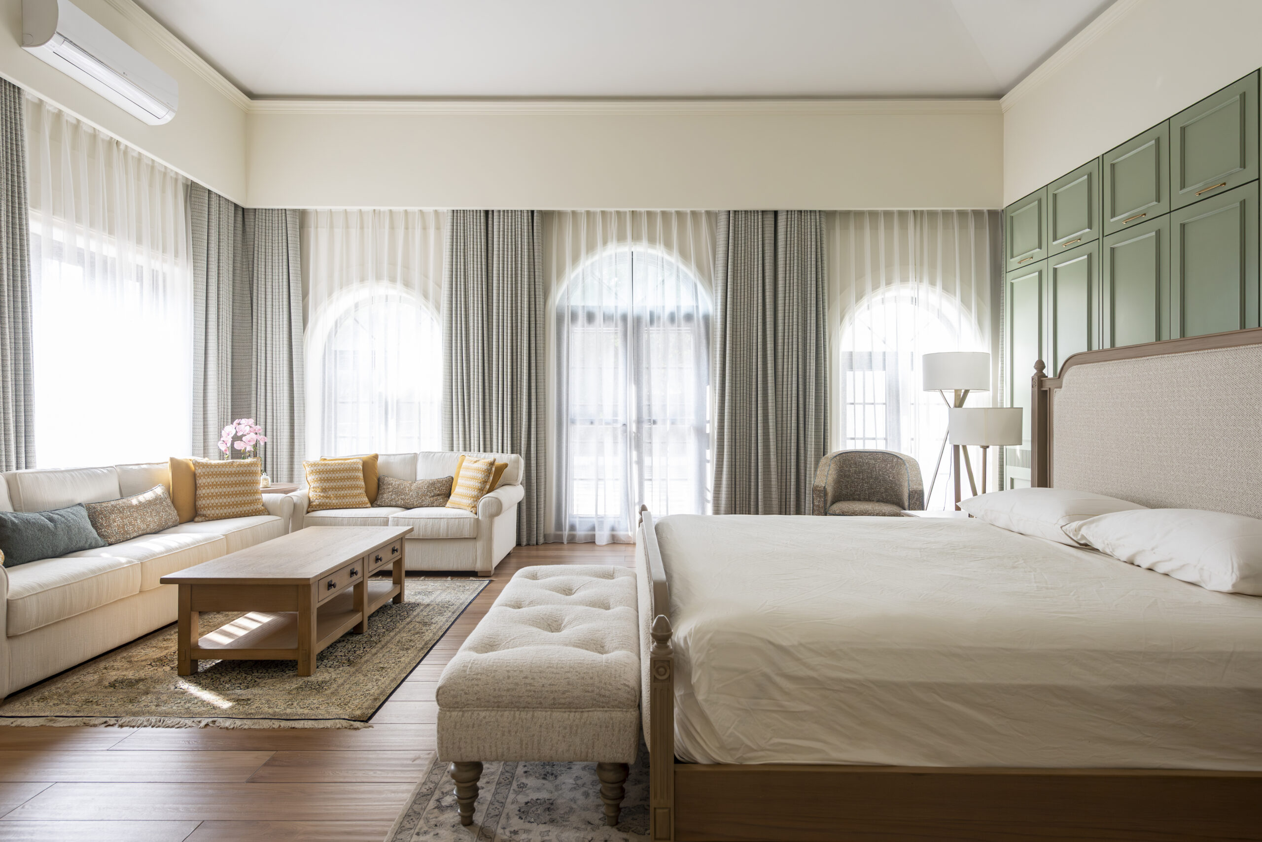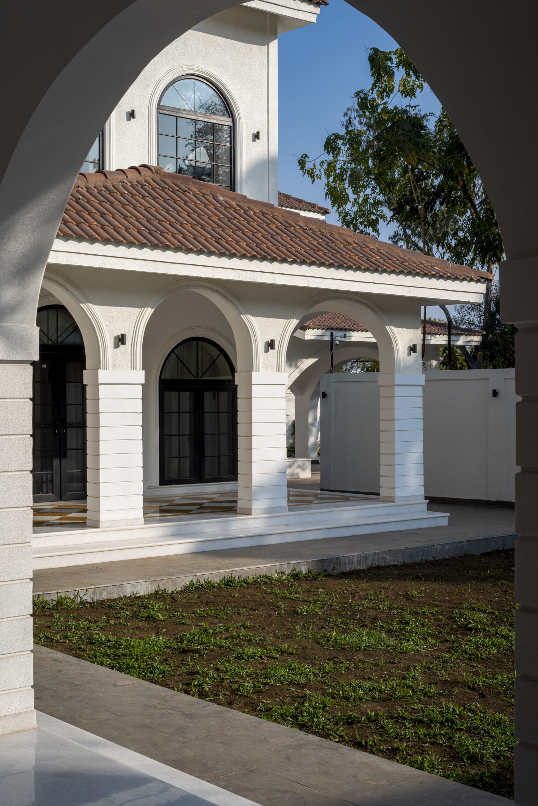 Defined by a quiet sense of grandeur, the residence brings together contemporary classical architecture with a warm, livable interior language. Symmetry, proportion, and arched forms establish a timeless framework, softened by a palette that feels refined yet comfortable.
