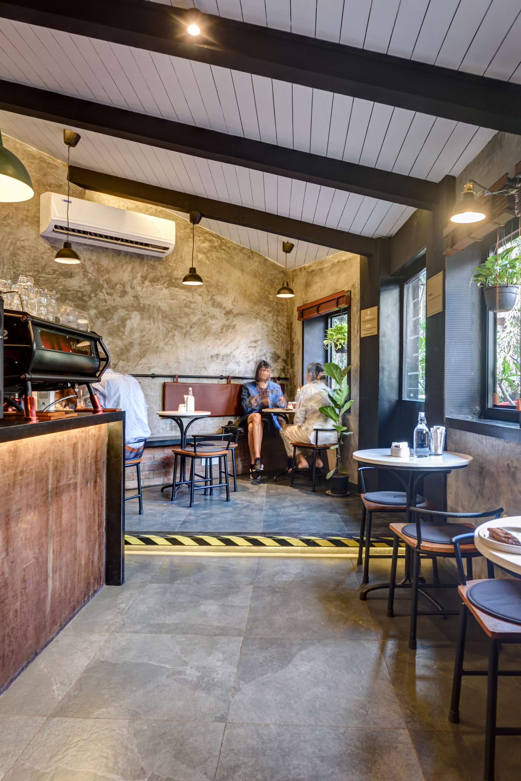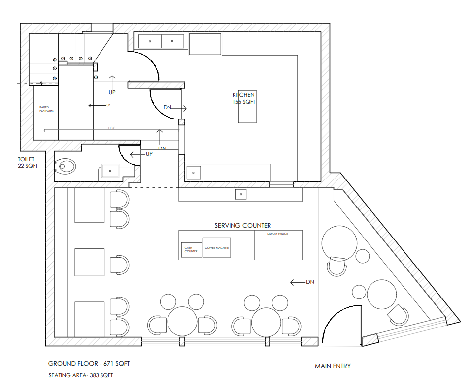 The layout is carefully planned to maximise flow within a compact area, balancing social interaction with comfort. Seating and circulation are designed to feel intuitive, allowing the café to function seamlessly throughout the day while maintaining a cosy, energetic atmosphere.