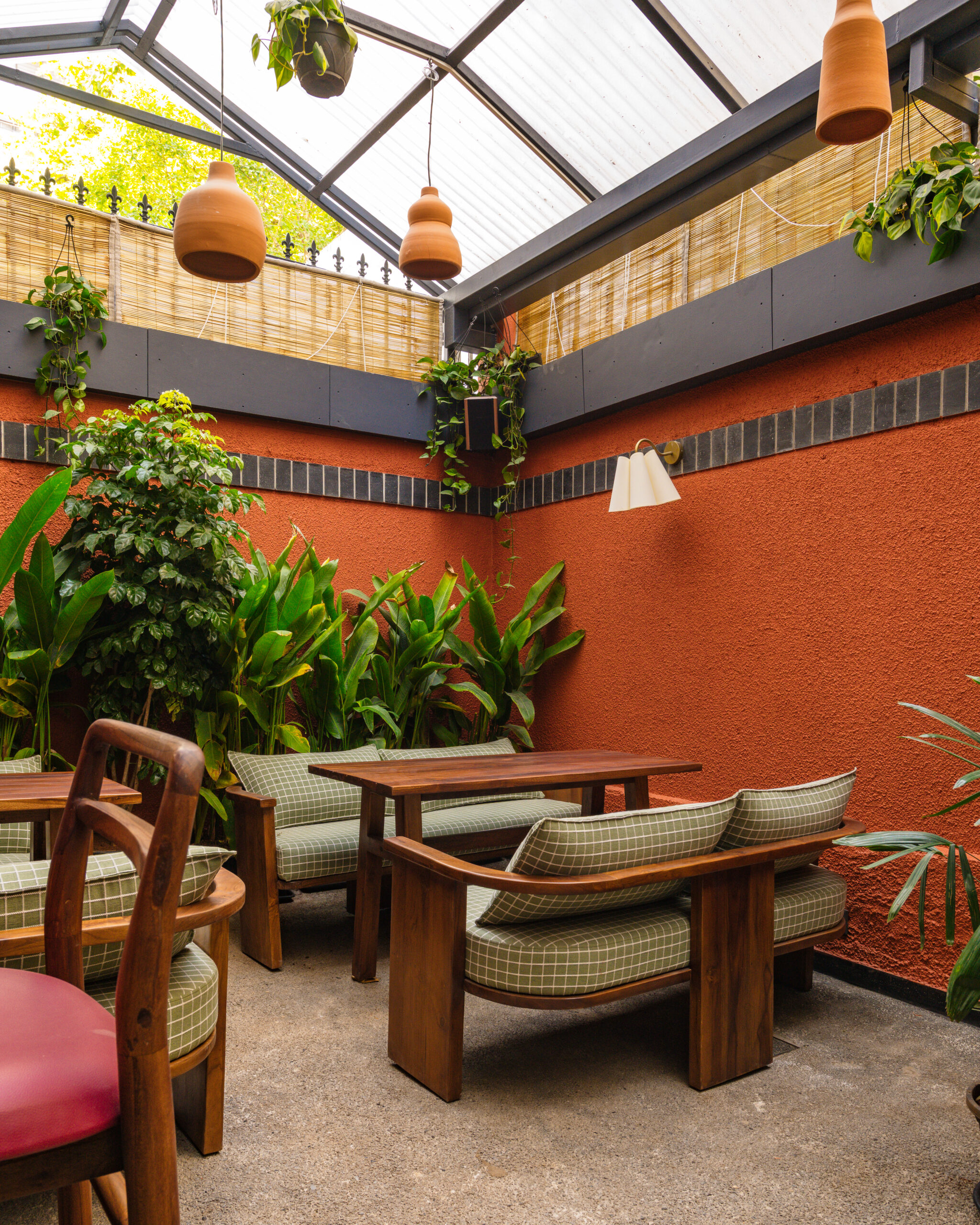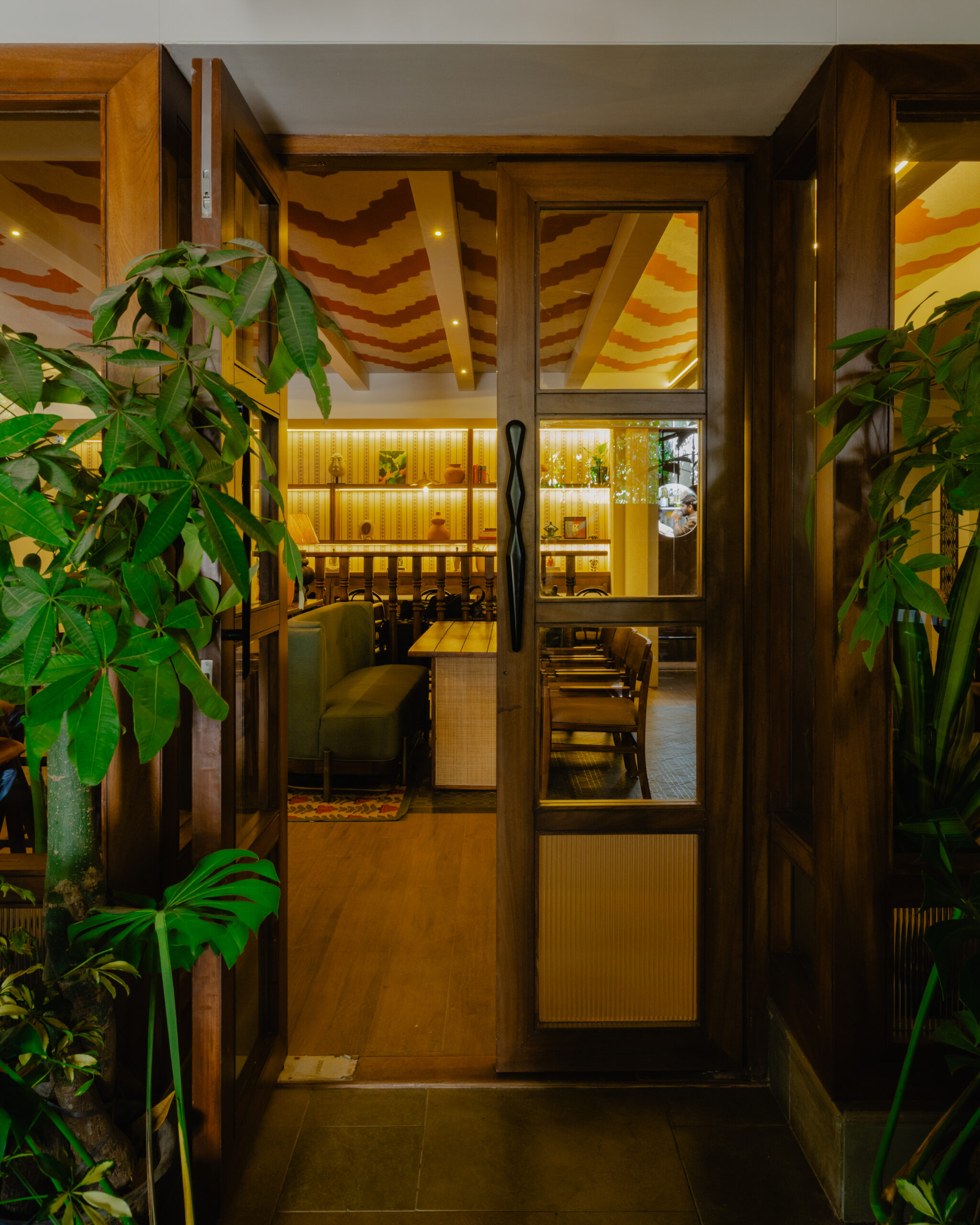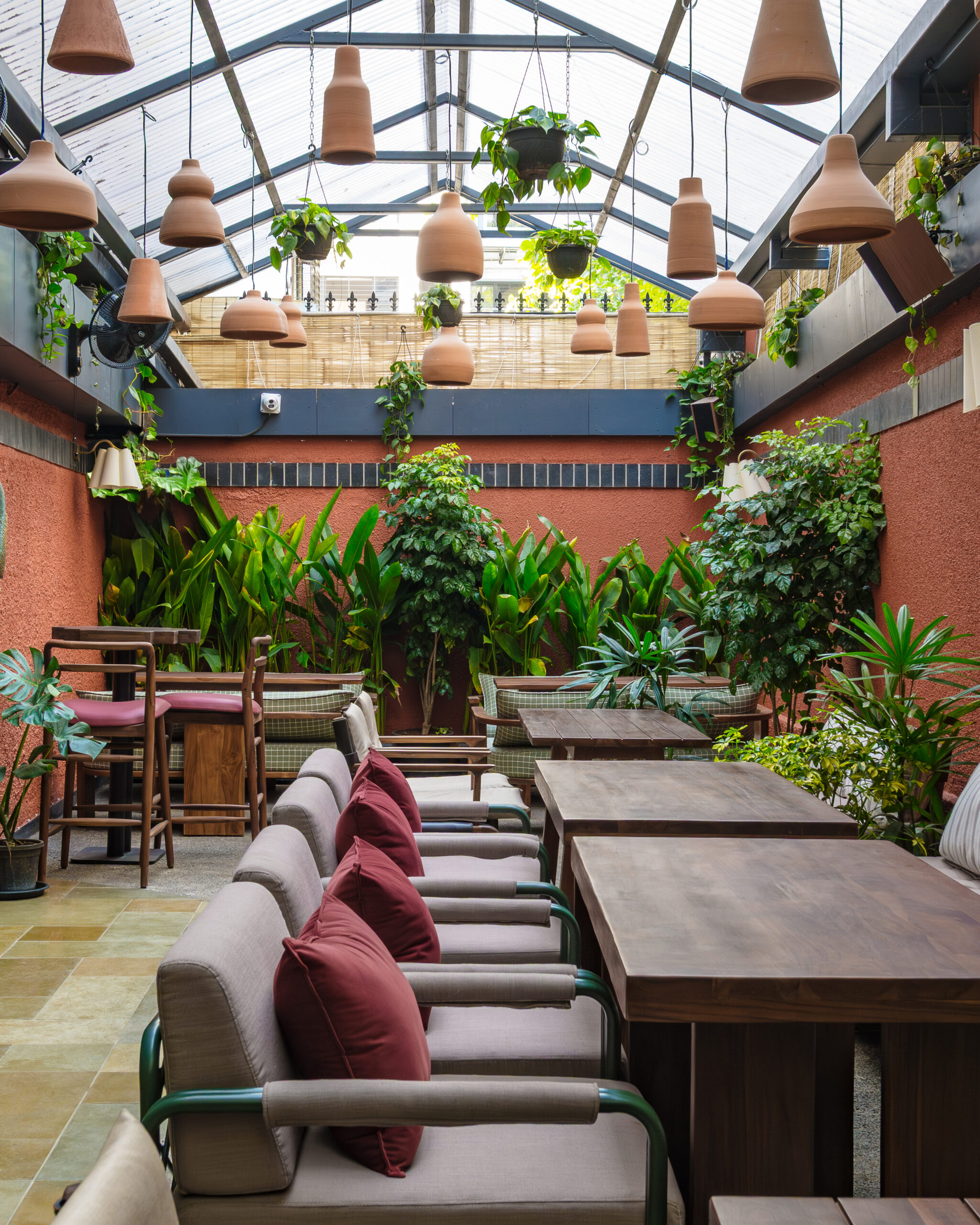 The interiors are defined by earthy materials like terracotta, exposed brick, natural stone, and teak wood, softened with lush greenery. Layered lighting enhances the ambience—shifting seamlessly from a relaxed daytime setting to a more intimate evening bar experience.